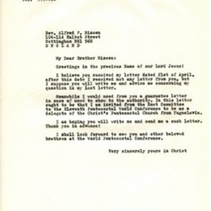 A letter by Ludvik Üllen to Alfred F. Missen requesting a recommendation letter for a visa to be able to visit the world Pentecostal conference. [Description English/roman)] Pismo Ludvika Üllen Alfredu F. Missenu u kojemu traži pomoć u obliku pisma preporuke kako bi mogao dobiti vizu za svjetsku pentekostalnu konferenciju. [Description (original non-English/roman language/script)]