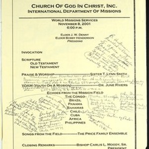 World missions services program, 94th Annual Holy Convocation of the Church of God in Christ, Memphis, Tennessee, 2001 November 8. Includes two pages of handwritten notes. [Description English/roman)]