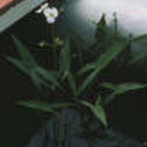 Tall green stalks emerging from water, with a white flower on one, at Delaware and Raritan Canal in New Jersey.