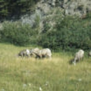 Five sheep grazing on a grassy area beside a highway road.