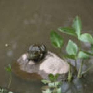 A North American bullfrog on a rock in a pond.