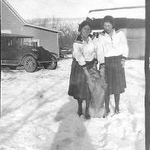 Photo--black and white: Myrtle and Mildred Kingwell circa 1923 with Queenie the dog. The twins were born in 1908 to parents Ben Rowe Kingwell and Josephine (Josie) Beedle Kingwell.