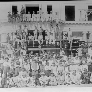 Workers posed in front of the Huntington residence during construction, circa 1910
