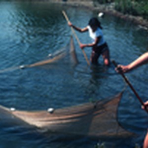 Students catch fish at pHake Lake using a seine, a fishing net that hangs vertically in the water.
