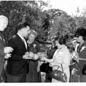 Photo--black and white: Don Hallberg, second from left, of O. A. Hallberg & Sons apple products, in Hallberg orchard showing apples to representatives of the Nut Tree and University of California, Davis. about 1960s