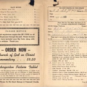Order Form (Eva Antwine) requesting Sunday School Literature from D.J. Young Publishing Company, 1969 Oct. 15. [Description English/roman)]