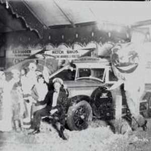 Photo--black and white: A group of children stand in front of the "Standard Oil Announcer" truck with the 'driver' seated on the front bumper of the truck at the Gravenstein Apple Show circa 1930s. Another man leans against the truck with a hugh papier mache apple-head. Signs behind the truck advertise Wetch Bros. Electric brooders and Poultry, H.B. Scudder Real Estate and Insurance, Aetna and Singer. "Borba Photo" is hand scratched at the bottom right.