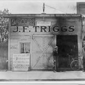 Photo J. F. Triggs bicycle repair shop at 214 S. Main Sebastopol. J. F. on right and one of his sons on the left. J. F. Triggs (John Francis) (1874-1951) Was Sebastopol merchant from 1915 to 1951. His businesses included a bicycle and repair shop to car dealership to auto parts and machine shop. And was also the town's locksmith. Triggs was interim town trustee replacing Scudder when Scudder went to state rep. Triggs had a dance club playing fiddle in his own group. Tickets were sold to Friday night dances held in Lincoln Hall and then above the Odd Fellows. Triggs was married to Arabelle Smith Triggs. Children: Ruth, Arthur, Glenn "Dutch" and Delbert Ernest "Deb." Triggs was also well known for his large gun collection.