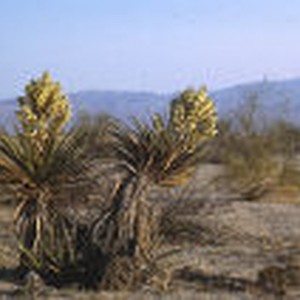 Two Mojave yucca flowers growing in a desert landscape framed by the mountains behind them.