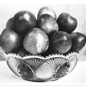 Photo--black and white: Glass bowl with plums. Burbank "Elephant Heart" Plum. Labeled: "K-22 "Elephant Heart Aug. 1929."