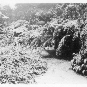 A tiny snapshot looking north in the garden canyon after a rare southern California snowfall. The thatched hut is visible on the left, and a man is standing amid the bushes in the center. MS note on verso reads "Jan. 15, 1932." MS notes on envelope say "Snow pictures at Huntington Library Jan. 15. 1932" and "from: Maurice Block estate, 1966."