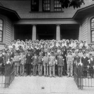 Photo--black and white, from Borba 8" x 10" celluloid negative: St. Sebastian's Catholic Church in Sebastopol circa 1920-1930s. All the girls are wearing white head coverings and the boys are wearing white are bands and are wearing suits. This church was demolished in the 1950s and a new St. Sebastian's was rebuilt in late 50's. This Church no longer exists, but was located around the area of Santa Rosa Avenue and Depot Street in Sebastopol. The church was "opposite the Layton cottages on Bodega Avenue, near the depot,"referring to the Northern Pacific Railroad that opened a line from Santa Rosa to Sebastopol in 1890.