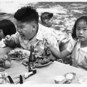 Roger Hong is in the foreground of the picture eating pasta. Nowland Hong is in the background behind Roger. Hong family papers. The Huntington Library, San Marino, CA.