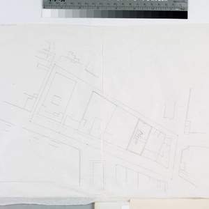 P. 3 of fastened document, "New High Street Grade..." showing elevations; profile of New High St., profile on graph paper, outline map on tissue paper featuring "Meyer" [Amestoy?] lot; cross section of proposed street, area between Temple & Franklin streets . Title supplied by cataloger.