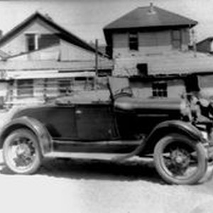Photo--black and white, from Borba 8" x 10" celluloid negative: A vintage convertible car, about 1930s standing in front of several buildings. Another car is seen to the right.