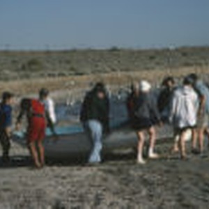 Group of students moving a boat along the shoreline.