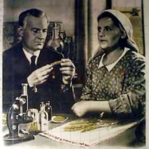 Soviet poster. Caption at the bottom reads, "Союз науки и труда -- залог высоких урожаев! / Soiuz nauki i truda -- zalog vysokikh urozhaev!", meaning, "The union of science and labor is the key to high yields!". [Description English/roman)]