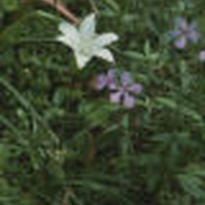 Large white flower surrounded by greenery and three purple flowers. Oglesby indicates photo was taken at "Dr. Barraud Wilderness Garden" and uses the term "Jamestown lily."