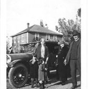 Print: black and white: The Rosebrook family picture in front of a vintage car and two story house. Caption on verso: "R's leaving for home after Thanksgiven time in 23." The two young girls are Charlotte and Marilyn Rosebrook (daughters of George & Leta Rosebrook).