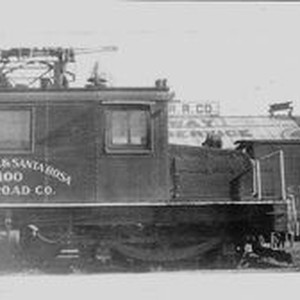 Photo--black and white: Petaluma & Santa Rosa electric railway Engine No. 100. Photo was taken January 2, 1935.