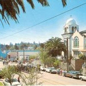 Postcard, Color-photo: Apple Blossom Festival parade in front of the First Methodist Church, 500 N. Main St during circa 1960's . The church was built in 1915. The Analy Theater, blue building can be seen in left center of photo and Chevron Gas Station to the right of it--which is the present location of Safeway Store. Caption on verso of postcard.