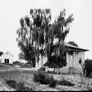 Photo--black and white: A Close-up view of the Burbank Gold Ridge Experiment Farm cottage and barn, about 1920s.
