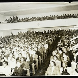 Photograph of a hall filled with people, Church of God in Christ convocation, Memphis, Tennessee, 1950. [Description English/roman)]
