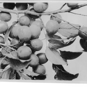 Photo, black and white: Plum cluster on branch. Handwritten on back: Plum MM-58 (E.T.) Cranberry Plum Photographed August, 1928."