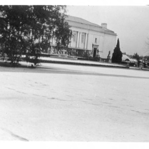 Tiny snapshot of the south façade of the library building after a rare southern California snowfall. MS note on verso reads "Jan. 15, 1932." MS notes on envelope say "Snow pictures at Huntington Library Jan. 15. 1932" and "from: Maurice Block estate, 1966."