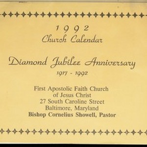 1992 church calendar, Diamond Jubilee Anniversary 1917-1992. First Apostolic Faith Church of Jesus Christ, Baltimore, Maryland