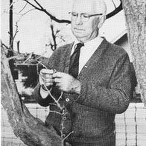 Mr. O. E. Bremner, former Sonoma county agricultural commissioner and friend of Luther Burbank. Bremner examines a graft of a Burbank plumcot on a Santa Rosa plum tree in his yard. Circa 1949