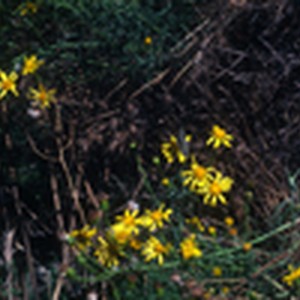 Yellow flowers on green stems with dried plants in the background.