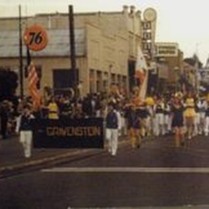 Photo--color--mounted: Apple Blossom Parade 1978 with the Gravenstein Junior High School band. Band members in navy blue and white uniforms. The 76 Gas station and Imperial Savings Bank are seen in the background.