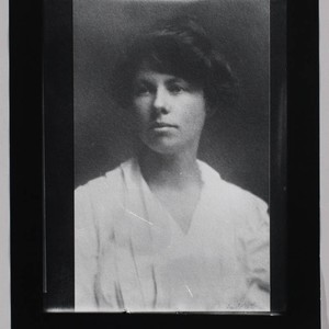 A head-and-shoulders studio portrait of Charmian London wearing a light colored blouse, with her head turned slightly to the left. Title devised by cataloger, date based on another, smaller copy of this image in JLP 537 LA 6 (p. 29).
