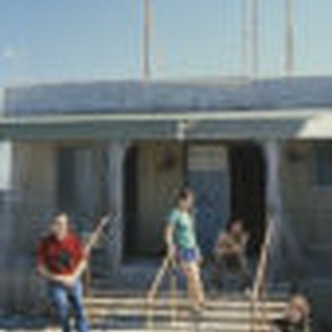 Students Laura Holmes, Rod Rolett, Julia Daugharty, and onlooker Gerhard relax on the front steps of a store in Bombay Beach.
