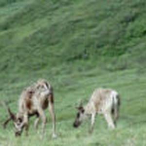 Two caribou feeding in a field of green vegetation near the Eielson Visitor Center.