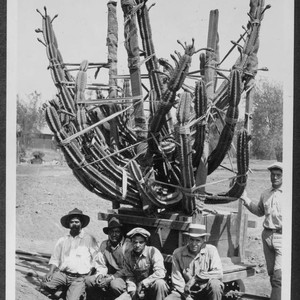 Five workers kneel and stand around this boxed and bound cereus specimen, on its way to its new home in the desert garden. The label that accompanies this photo in the album reads "Cereus x daramii transplanting, N. B-80."