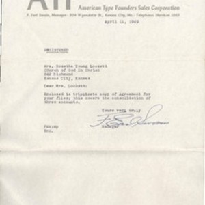 American Type Founders Sales Corporation, letter, 1949 Apr. 11, to Rosetta Young Lockett regarding account agreement, invoice. [Description English/roman)]