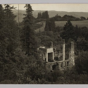 An elevated view of the ruins of Jack London's Wolf House in Glen Ellen, California, after it burned down in 1913. The house is surrounded by trees and there are hills in the background. Title devised by cataloger, date supplied by cataloger based on the year of the fire. Date on envelope is "[>1960]".