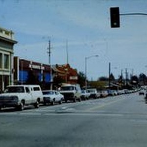 Sebastopol South Main (east side) junction of Highway 116 and 12 in Sebastopol, California, location of Sierra National Bank, the Sebastopol Times and Joe's Budget Store, 1970s