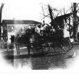 Photo--black and white: Pacific Christian Academy, Santa Rosa, about 1926-27 with a wagon with children being pulled by a mule. Two wooden clapboard buildings in the background.
