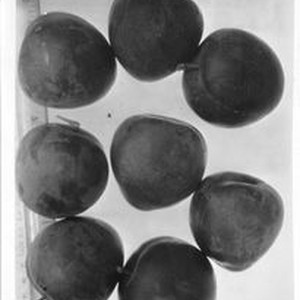 Photo--black and white: A group of plums with a ruler behind. Plums K-22 Aug 1929. Elephant Heart.
