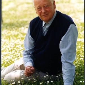 Color photo of Charles Handy sitting outside in a vest holding flowers, taken by Elizabeth Handy. Charles is sitting, leaning on his left hand toward the camera, and holding flowers in his right hand. He is gazing directly into the camera lens.