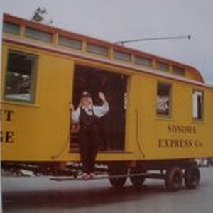 Photo--color: Apple Blossom Parade, Sebastopol April 15, 2000. The restored Petaluma & Santa Rosa Railway boxcar, restored by Millerich Brothers.