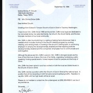 Shirley Payne (Metropolitan Development Council), Tacoma, Washington, letter, to Emma F. Crouch (Church of God in Christ), Dallas, Texas. [Description English/roman)]