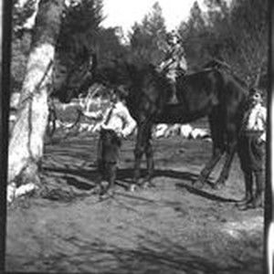 Photo--black and white: Three children around a horse. One boy holds the reigns of the horse while a younger child sits atop the standing horse. A third boy stands to the rear of the horse. Circa 1920-30.
