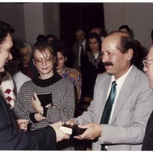 Fotografija Mihaela Kuzmiča kako novokrštenom starijem čovjeku pruža Bibliju kao poklon. [Description (original non-English/roman language/script)] Photograph of Mihael Kuzmič presenting a newly baptized older man with a Bible as a gift. [Description English/roman)]