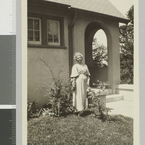 Ninetta Wiley Eames Payne stands in front of residence in a white dress.
