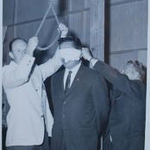 Photo--black and white: Sebastopol Lions Club scrapbook photo: Lions Club 'debunking' of Glenn Klineman. L-R: Jack Fore, Glenn Klineman and Dick Jackson. Circa 1955