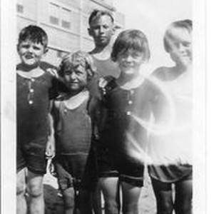 Photo--black and white: Front row: Bob Sinclair, Betty Sinclair, Letha Fitzgerald, Jim Sinclair. Back: John "Buddy" Fitzgerald, at Manhattan Beach, California in 1927. The two Fitzgerald children are grandchildren of Letha (n. Sullivan) Coyan and children of Mary Isabel Coyan Fitzgerald. The Sullivan family were early pioneers to Sonoma County and Graton.